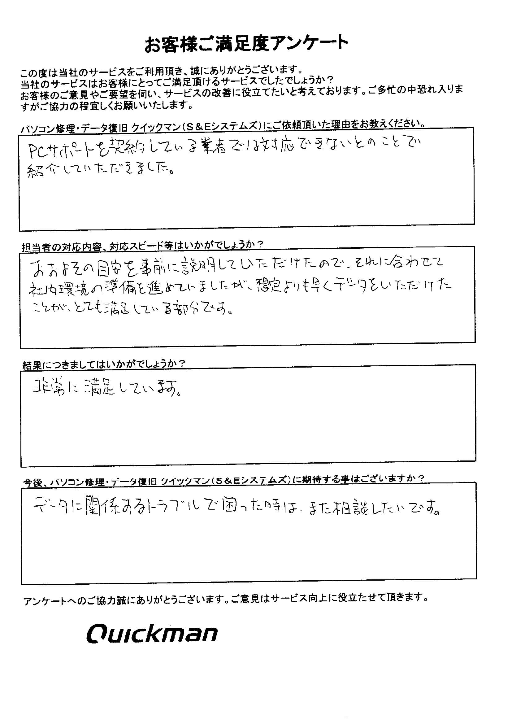 初めてのデータ復旧で不安な点もあったが、気軽に質問できたので社内への説明もスムーズに行えました。