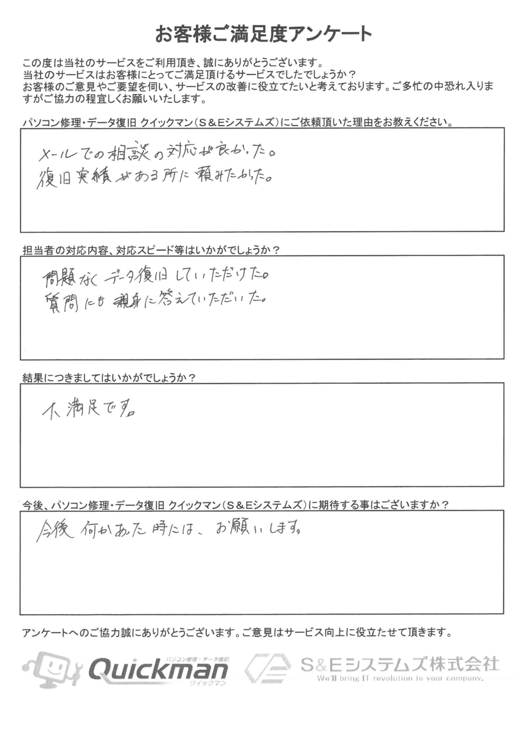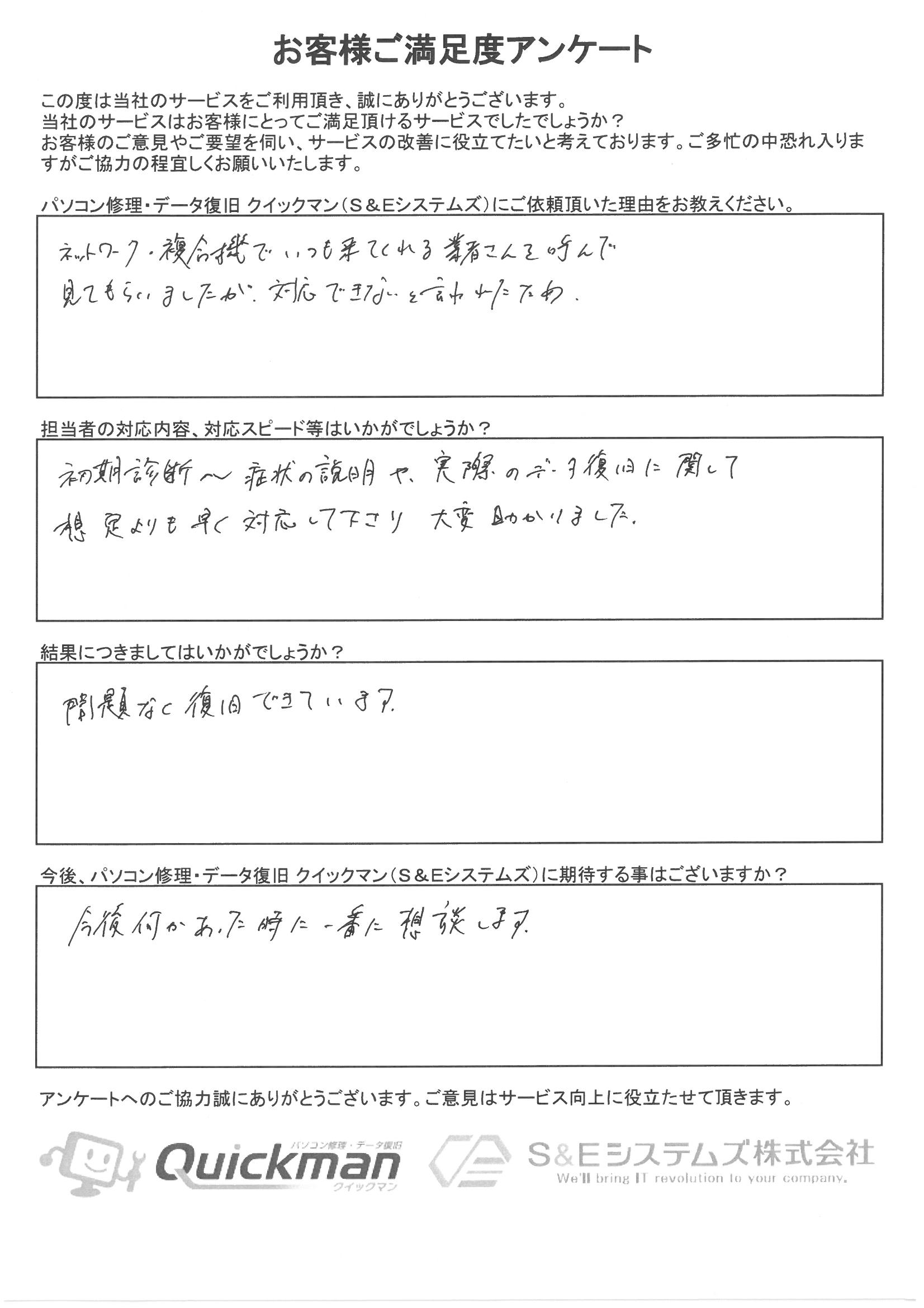 直筆のお客様のお声を掲載させていただいております。大阪・近畿周辺でデータ復旧にお困りならクイックマンへぜひご依頼ください。