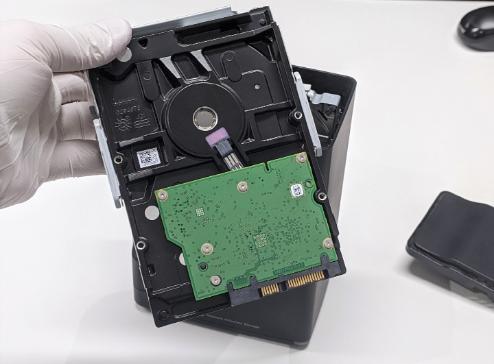 内蔵されている2台のハードディスクをそれぞれ専用機器で診断しました。結果として、1番ハードディスクに不良セクタが発生している物理障害、2番ハードディスクには物理障害は発生していない状態を確認しました。正常な2番のハードディスクからRAID情報を確認した結果、お客様からお聞きしたとおりRAID0で構成されていることが確認できました。データを復旧する為には、1番2番両方のハードディスクの情報が必要となるため、総合的に物理障害の判定をしました。