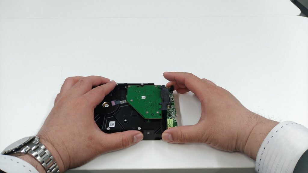 専用機器を使用にてハードディスクの診断を行ったところ、モーターの回転が開始されてからほどなくしてカチカチ音が発生しました。ハードディスクを開封してのヘッド交換作業が必要と判断し、重度物理障害での対応を行うことにしました。