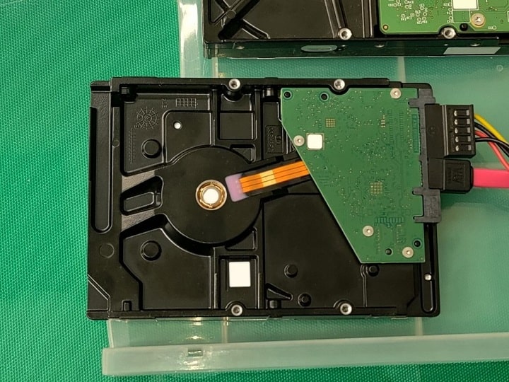 データ復旧専用機器にてハードディスクの起動確認を行ってみると、正常に起動できることが確認できたのですが、ファームウェアなどの制御情報へのアクセスを行おうとすると、全く制御ができなくなる状態になり、情報の読み出しができなくなってしまいました。データの読み書きを行うヘッド部分の破損が発生している可能性が高かったため、重度物理障害での対応を行うことにしました。