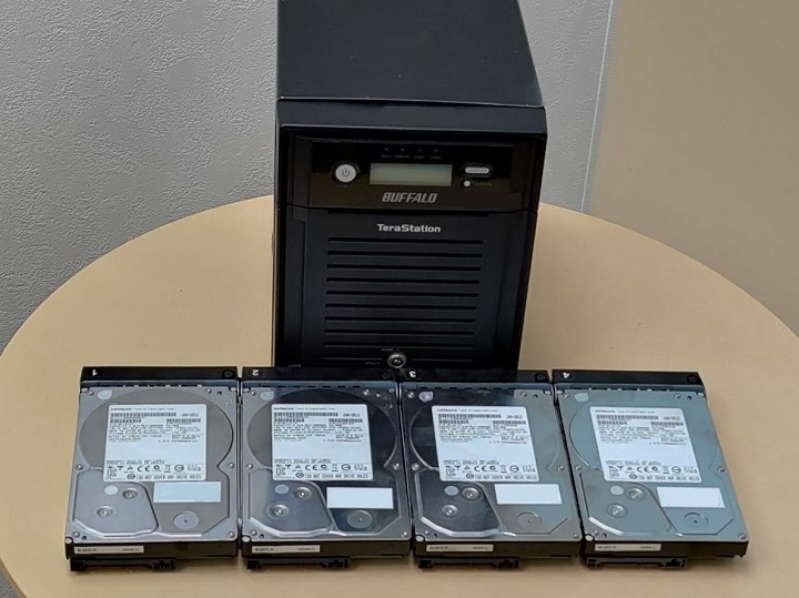 突然アクセスできなくなったLANDISKをお持ち込み頂きました。LANDISK中にブザー音がした後アクセスできなくなったとお伺い致しました。まずはLEDが赤く点滅している1番スロットのHDDをデータ復旧専用機器に接続して診断を行います。診断結果としては不良セクタが発生している事が分かりました。また恐らくHDDに物理障害が発生したタイミングでRAID情報が失われ、RAID崩壊を引き起こしたと判断致しました。まずは1番HDDの物理障害を取り除いたクローン作製をし、その上で他のHDDとソフトウェア上でRAIDを構成し中に入っているデータを取り出す方法です。上記をお客様にご案内した所、正式に復旧ご依頼を頂きました。早速復旧作業に着手します。