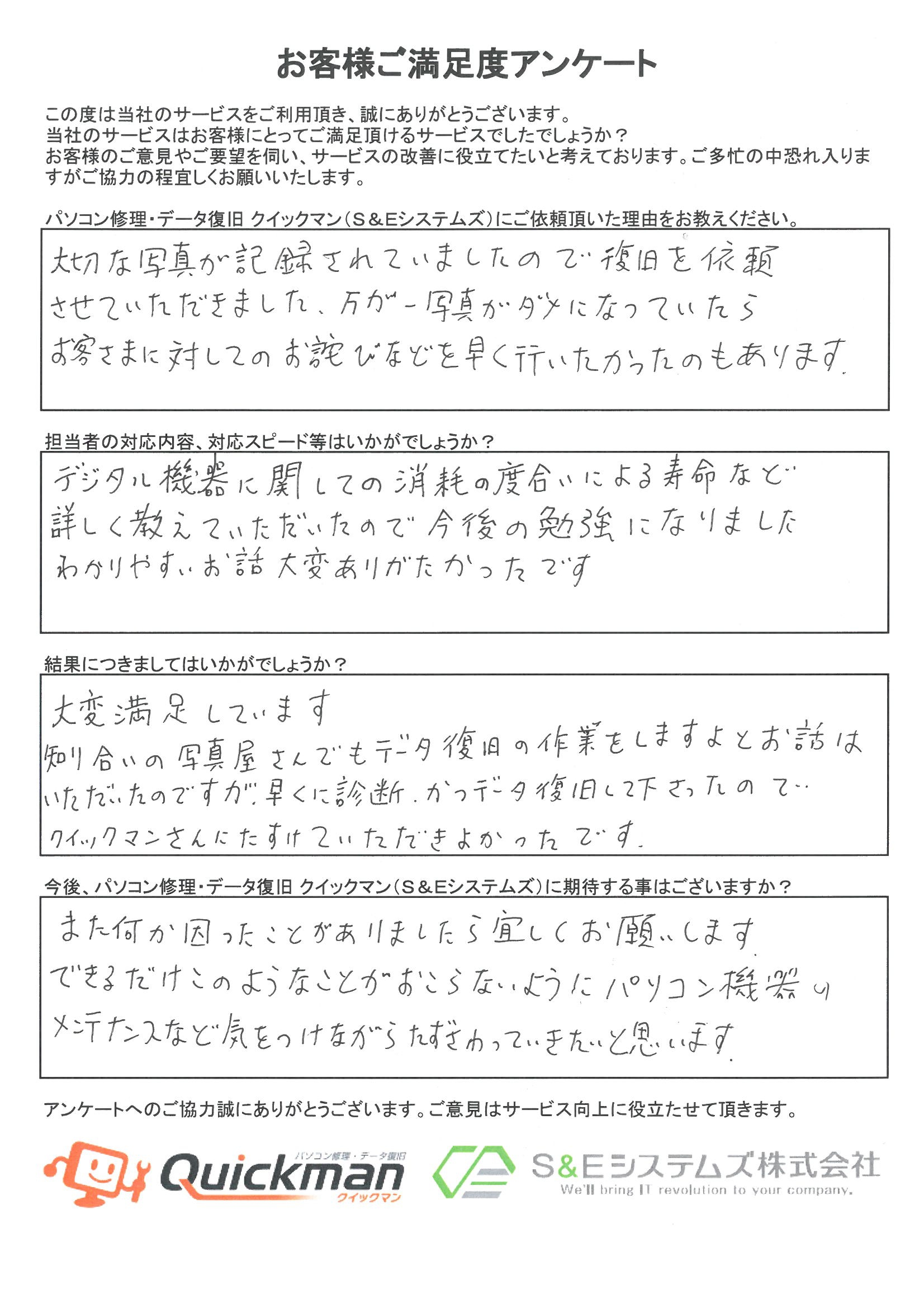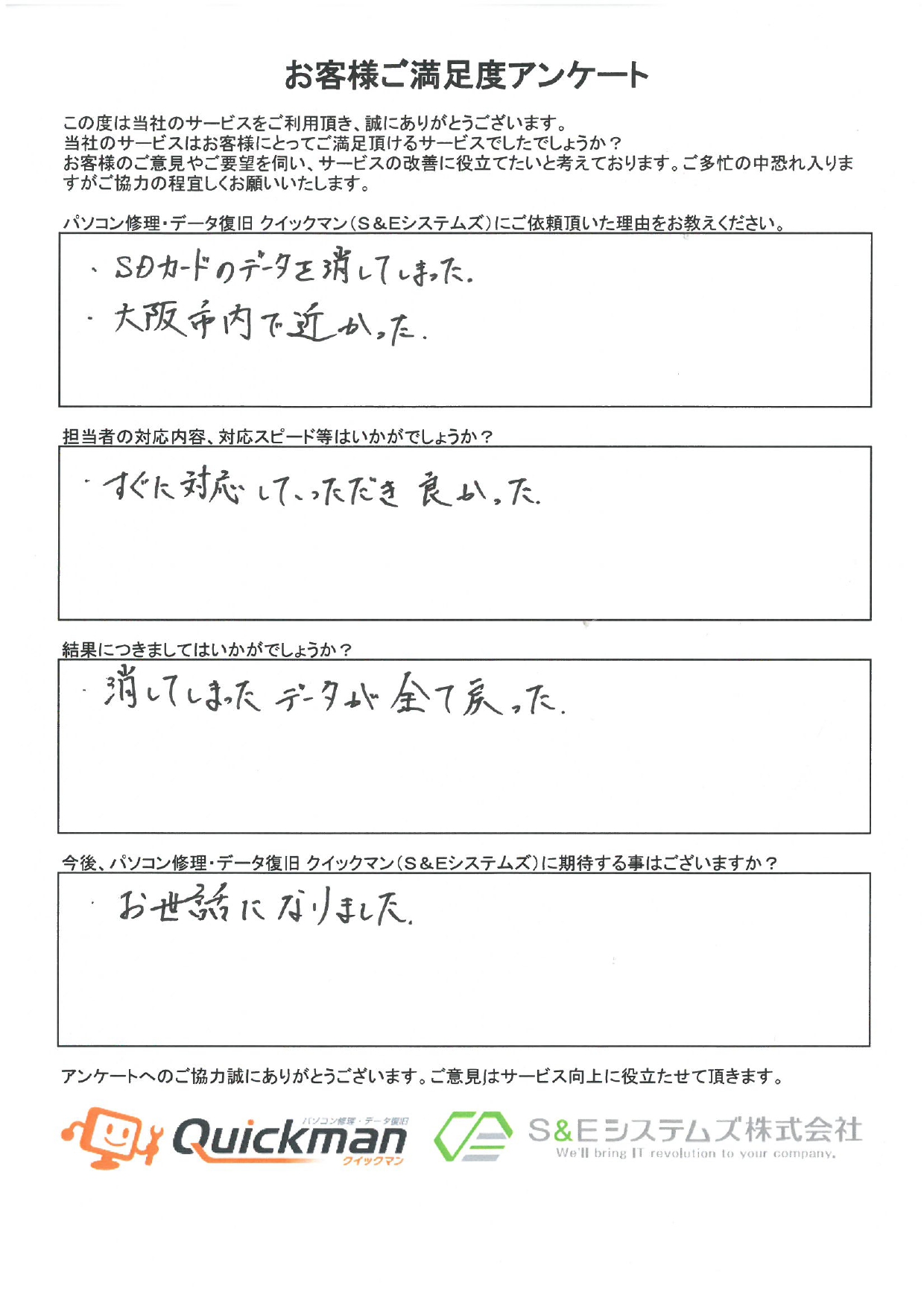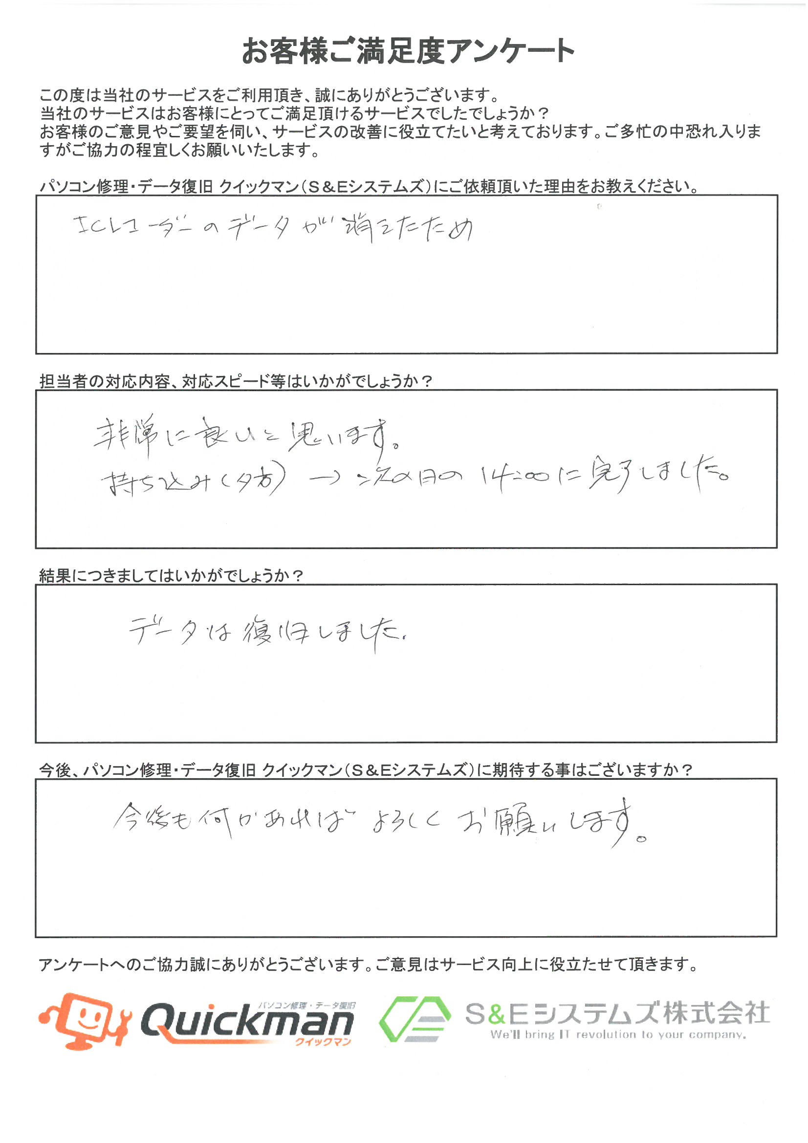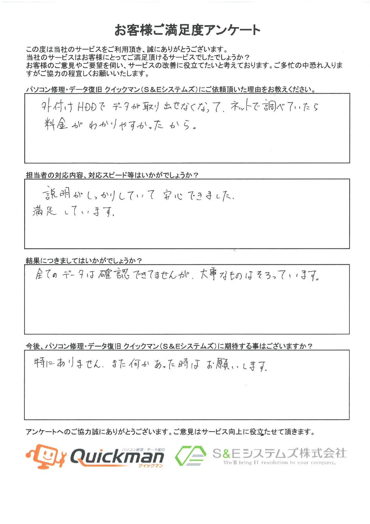 当社のデータ復旧をご利用頂いたお客様から頂いたお声をご紹介いたします。