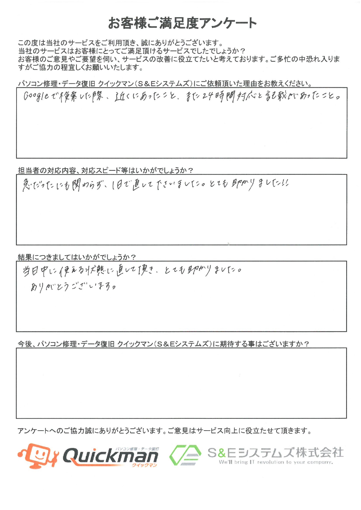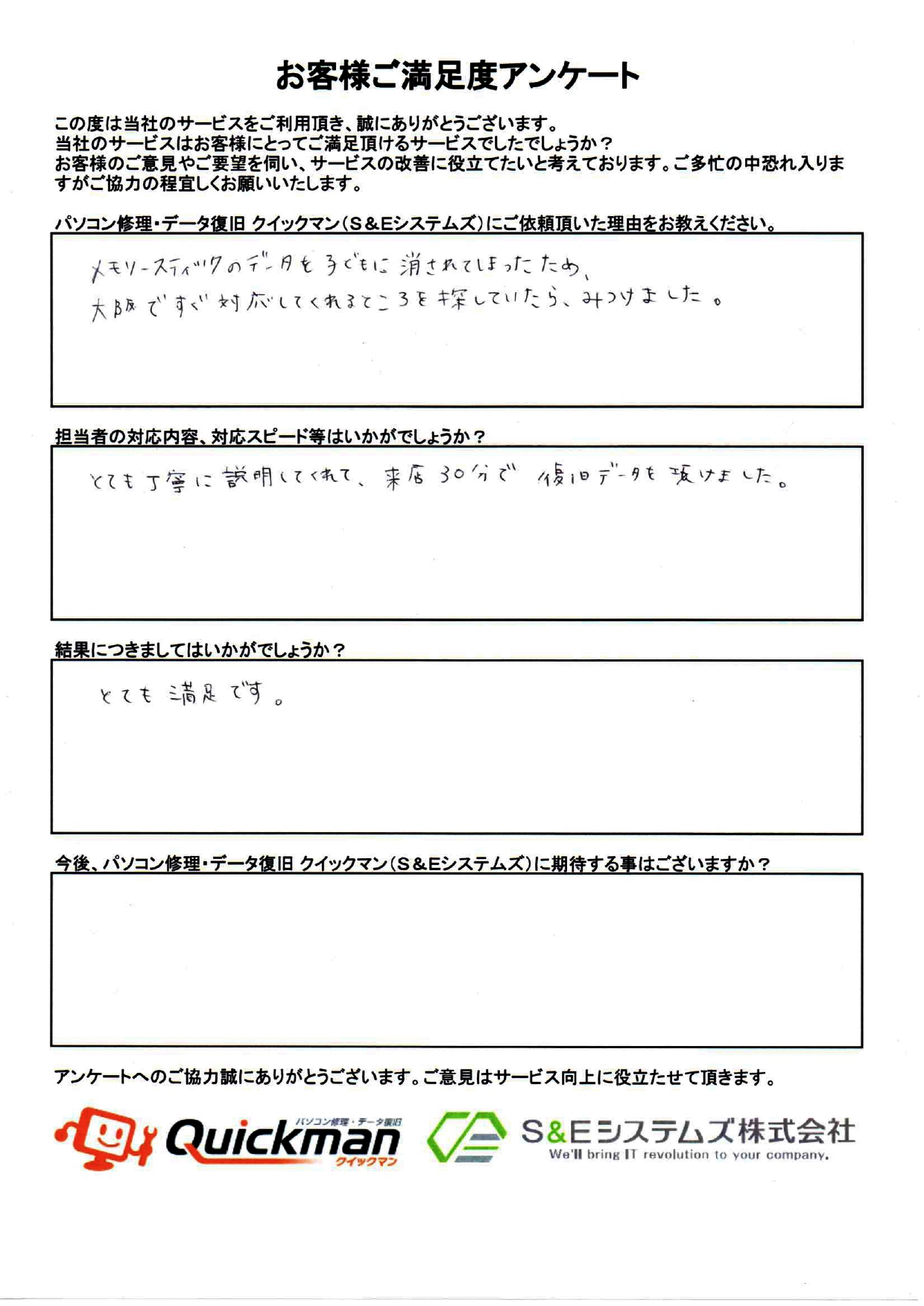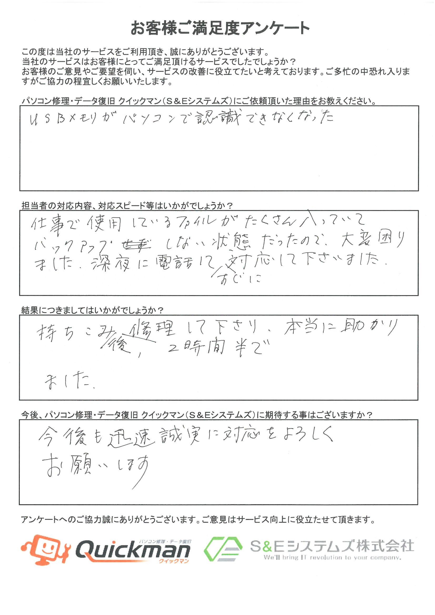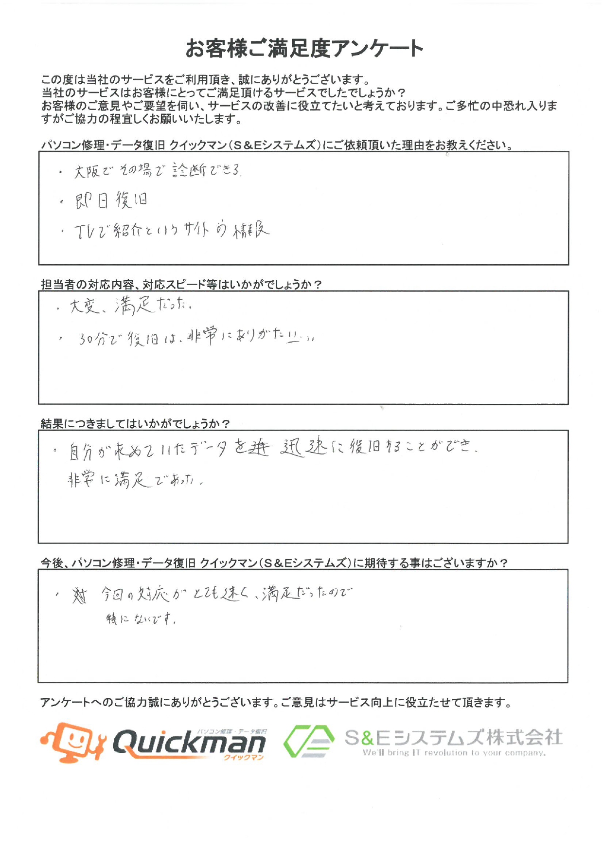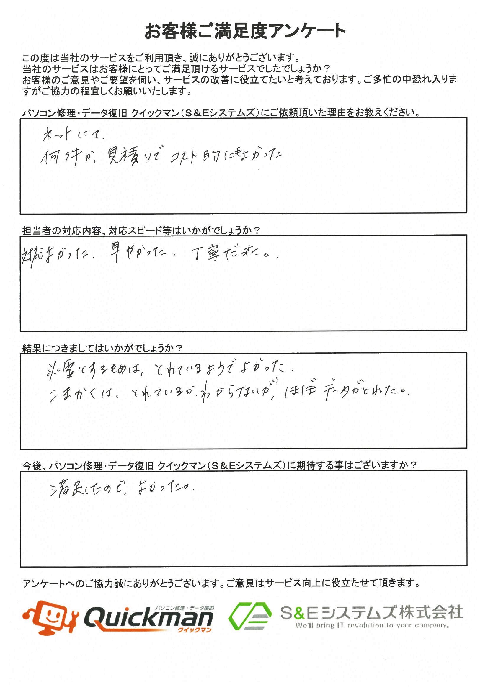 当社のデータ復旧をご利用頂いたお客様から頂いたお声をご紹介いたします。