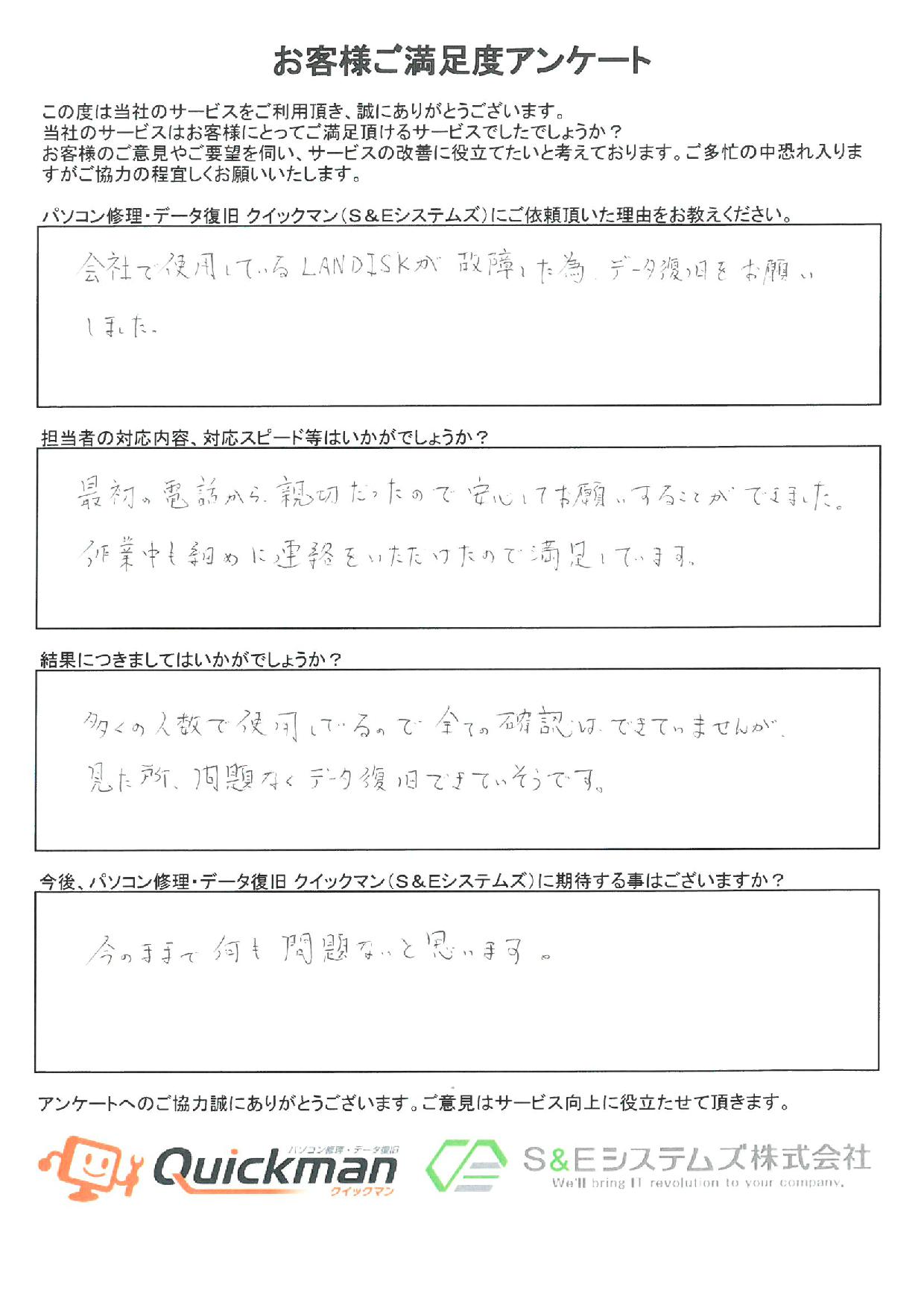 会社でお使いのLANDISKからデータを復旧させていただいた男性のお客様