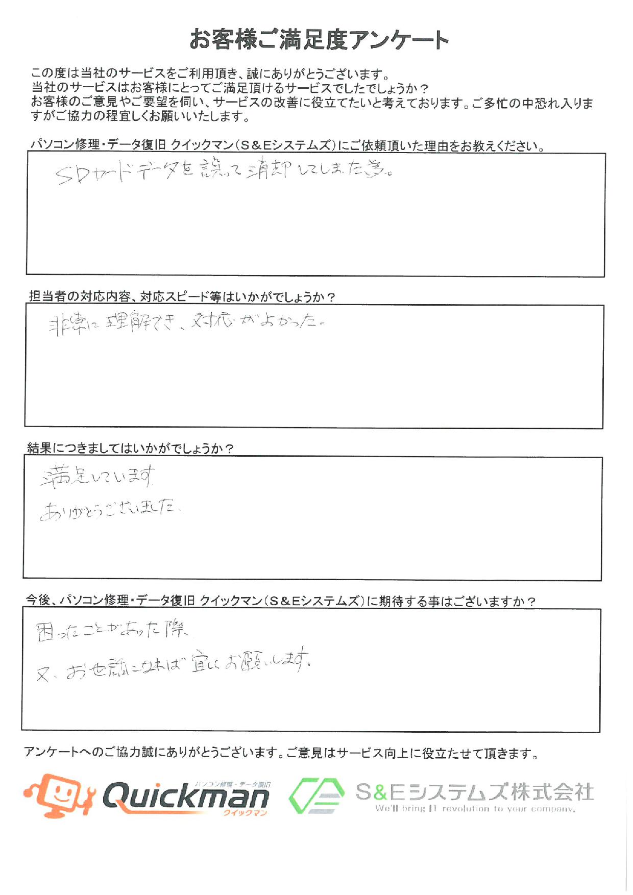 お仕事でお使いのデータを誤って消去してしまったSDカードからデータ復旧させていただいた男性のお客様