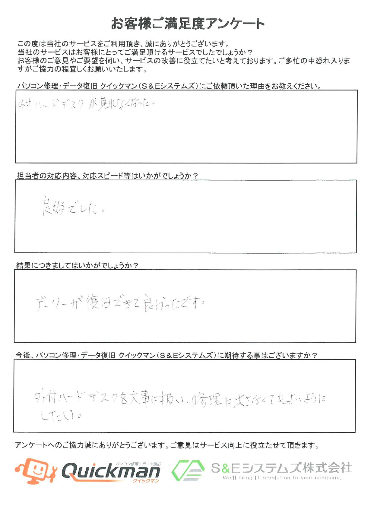 エンドユーザー様の外付けハードディスクからデータ復旧をさせていただいた男性のお客様