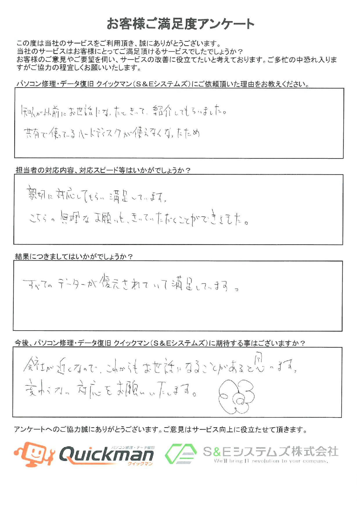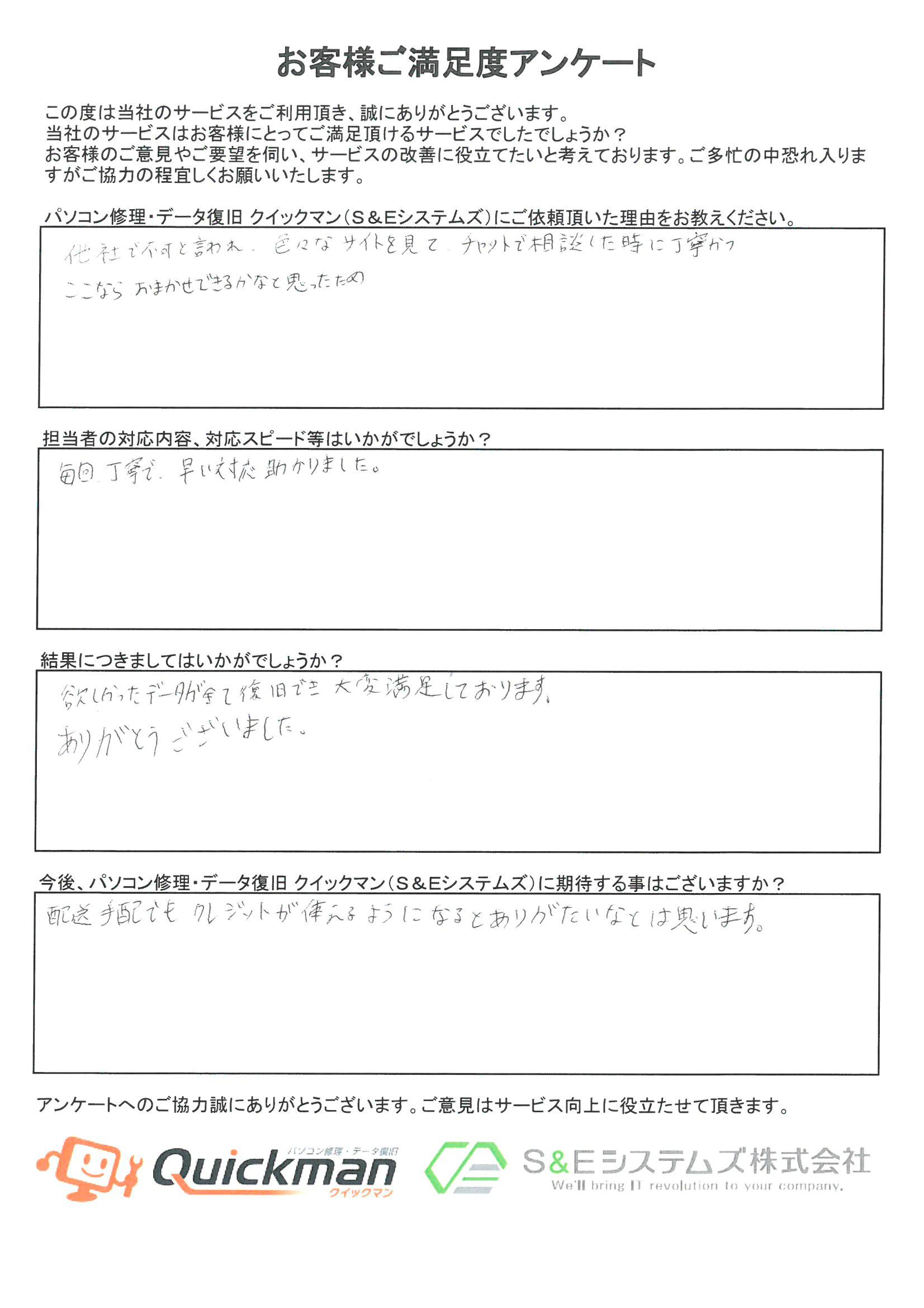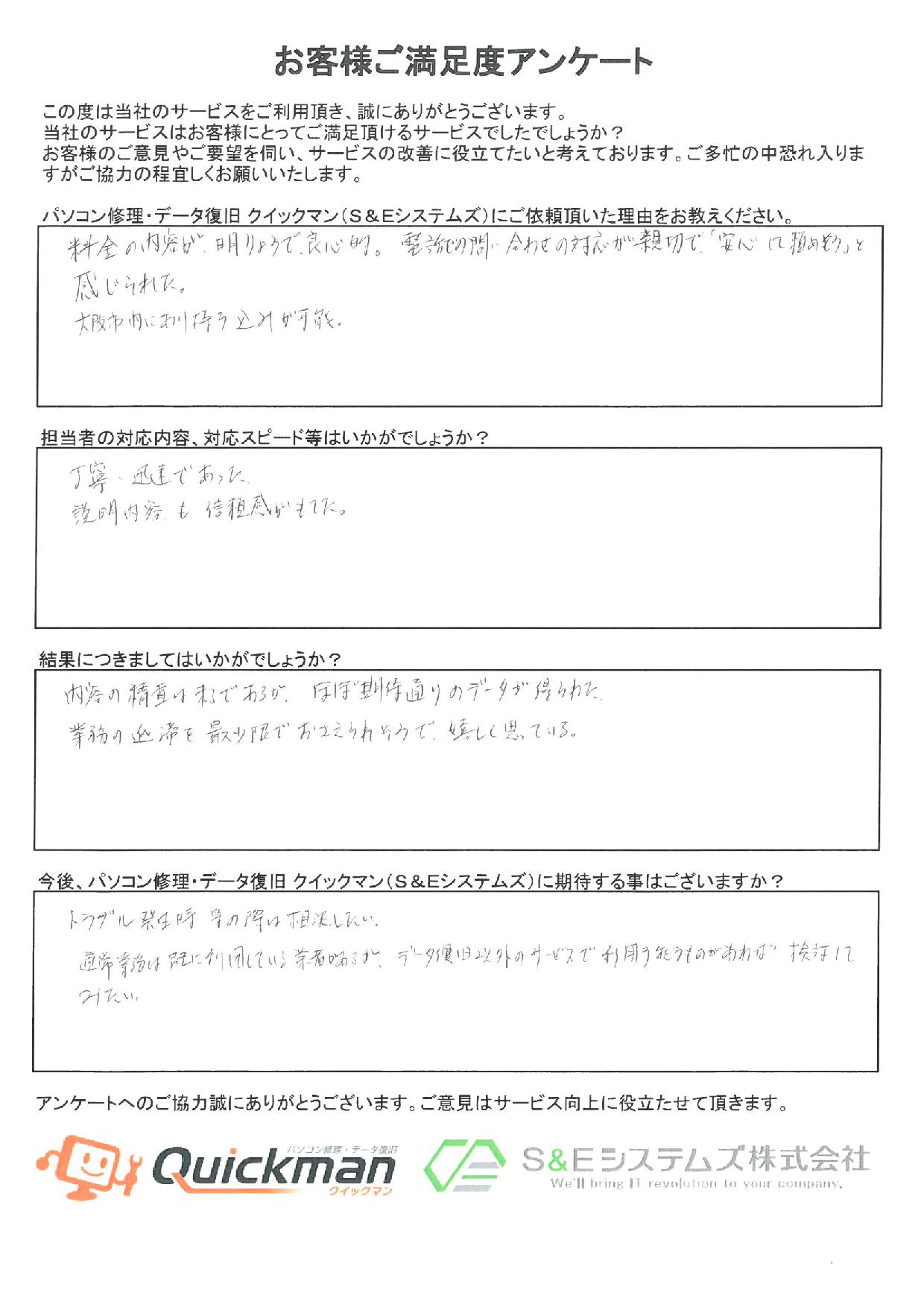 当社のデータ復旧をご利用頂いたお客様から頂いたお声をご紹介いたします。