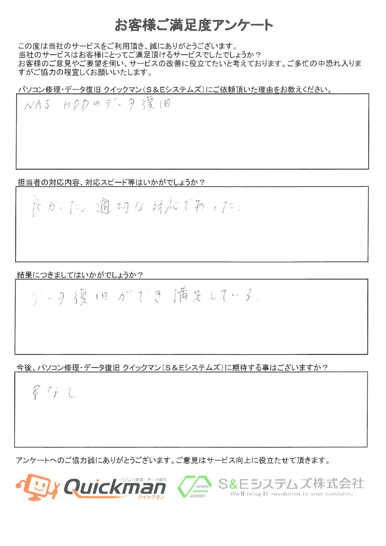仕事でデータ共有で使用していたNASからデータ復旧させていただいた男性のお客様