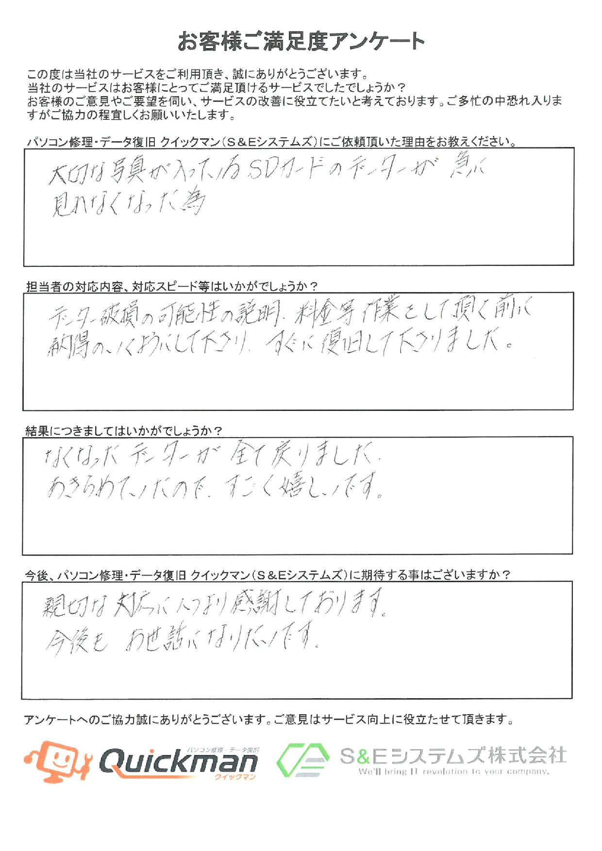 大切なお写真のデータを復旧させていただいた女性のお客様