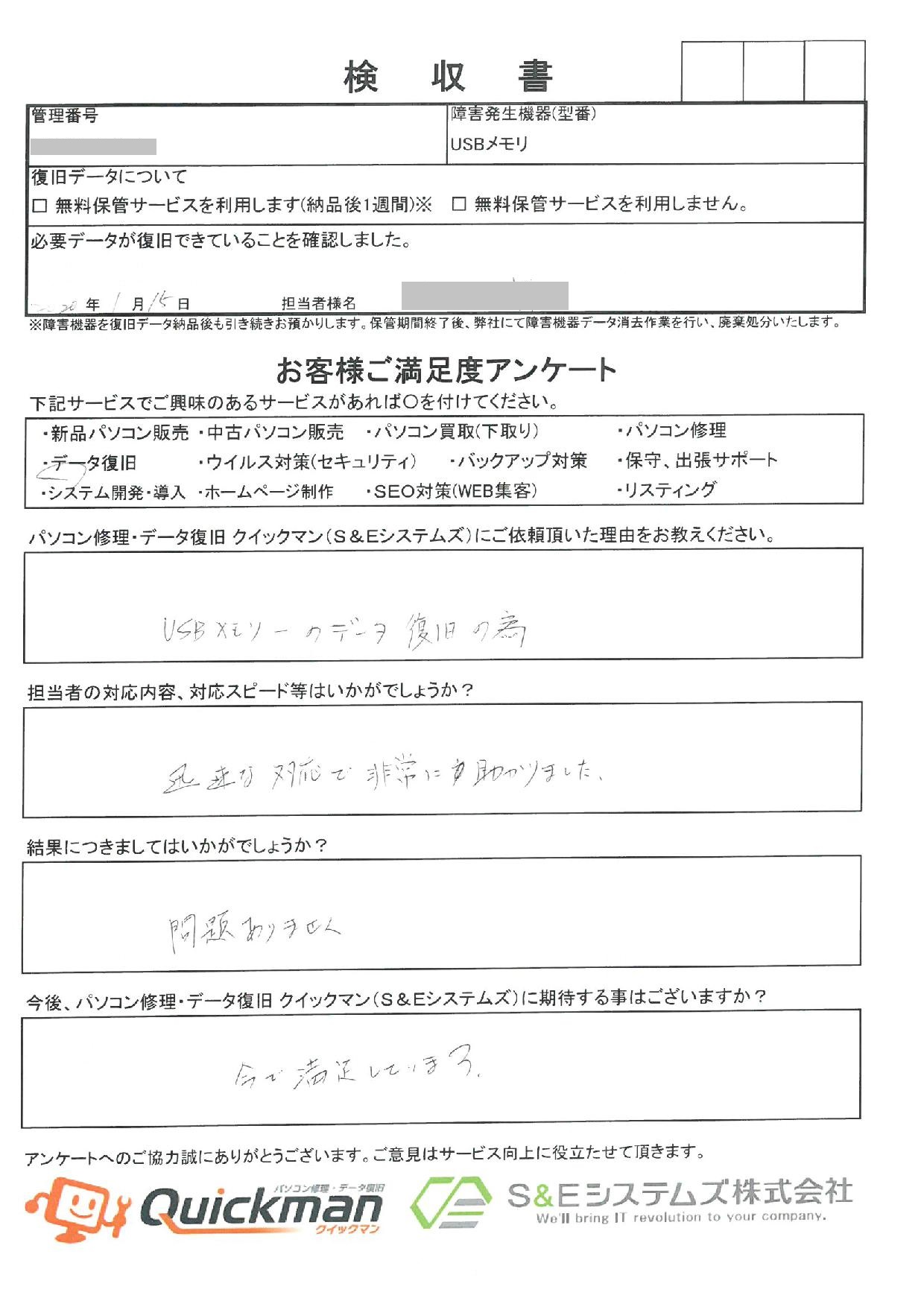 古いPCのソフトで使用されていたUSBメモリからデータ復旧させていただいた男性のお客様