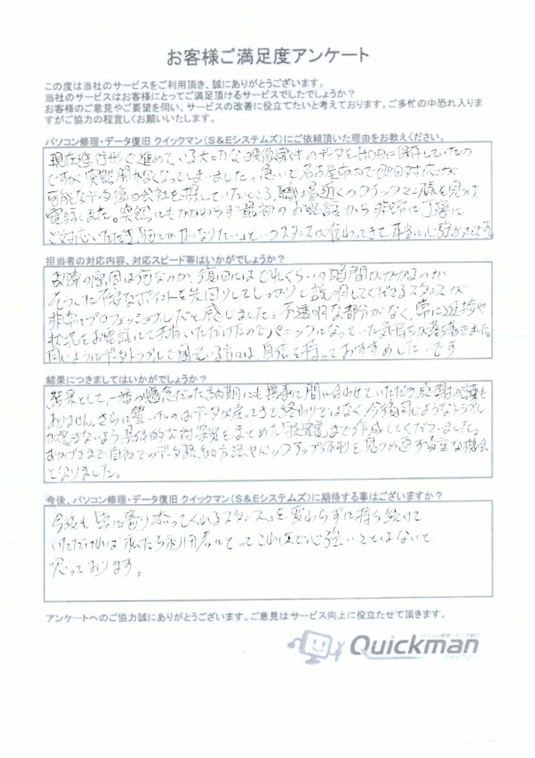 直筆のお客様のお声を掲載させていただいております。大阪・近畿周辺でデータ復旧にお困りならクイックマンへぜひご依頼ください。
