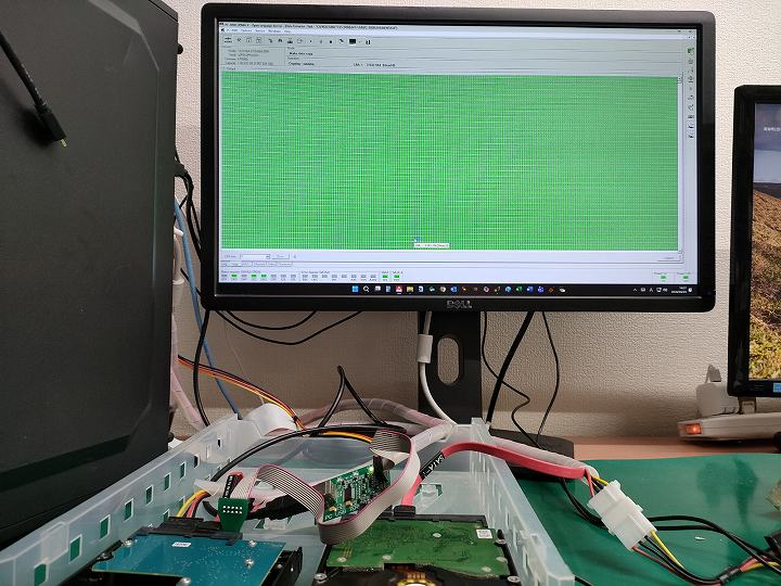 不良セクタが多発している2台目を専用設備(PC-3000)で制御。傷のある領域に負荷をかけないよう、読み取り速度や方向を細かくチューニングしながら、安全な領域から優先的にデータを抽出(クローン作成)しました。