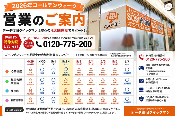 2026年ゴールデンウィークもNAS・サーバー・HDDのトラブルはクイックマンへ