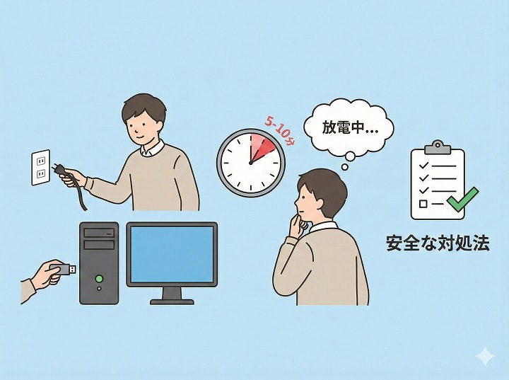 - 原因:電源ユニットの故障、マザーボード(基板)のショート、または単なる帯電(電気の溜まりすぎ)。
