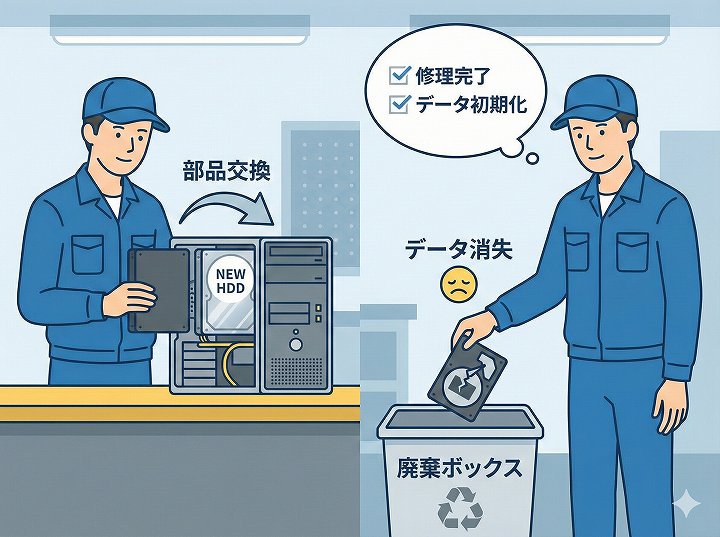 彼らの修理方法は、壊れたHDDやSSDを「新品に交換する」ことです。当然、元のデータが入った部品は取り外され、交換後のパソコンは「空っぽ(初期状態)」になります。