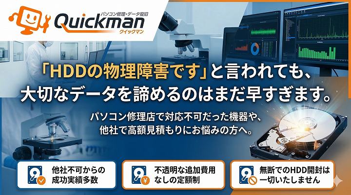 修理店様で断られてしまった機器や、他社の高額な見積もりに悩まれている方は、ぜひ一度データ復旧クイックマンの無料相談をご利用ください。適正な定額制料金と確かな技術で、あなたの大切なデータを救出いたします。